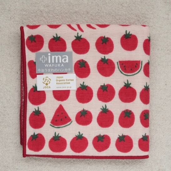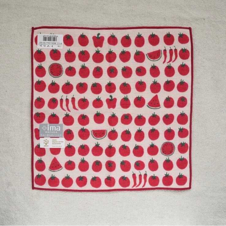 トマト時々スイカ、パプリカ、唐辛子柄がユニークなタオルハンカチ